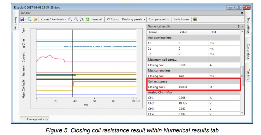 Bir zamanlama testi gerçekleştirdikten ve sonuçları indirdikten sonra, grafik ve sayısal sonuçları içeren pencere Şekil 5’te gösterildiği gibi görünecektir. Ölçüm sırasında bobin direnci ölçümü seçeneği etkinleştirildiyse, “Bobin direnci” bölümü “Sayısal Sonuçlar” sekmesi (Şekil 5’te kırmızı çerçeveli).