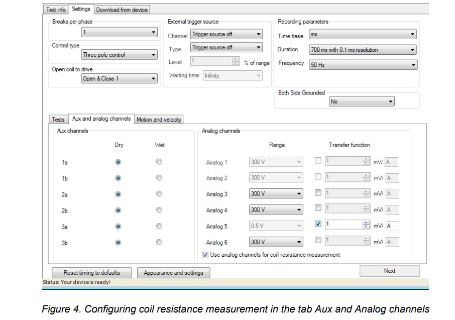 Bobin direnci ölçümü için analog kanalları kullanın” seçeneği etkinleştirildiğinde, önceden seçilmiş bobin kontrol kanallarıyla, uygun analog kanallar bobin voltajı ölçümü için ayrılacak ve diğer amaçlar için devre dışı bırakılacaktır. Örneğin, Açma ve Kapama 1 bobin kontrol kanalları seçilirse, Şekil 4’te görülebileceği gibi, bobin voltajı ölçümü için Analog 1 ve Analog 2 analog kanalları kullanılır ve diğer amaçlar için devre dışı bırakılır. Başka amaçlar ve ölçümler için kullanılabilir.